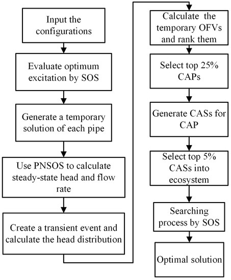 Yeh and Lin [35] developed a numerical approach, termed PNSA, for estimating the steady-state nodal head and flow rate for any given pipe network. This approach uses the SOS in lieu of the SA in PNSA to solve an optimal water head distribution and the nodal flow rates in a network. The flowchart of PNSOS is shown in Figure 1.