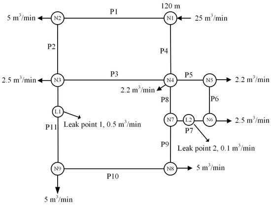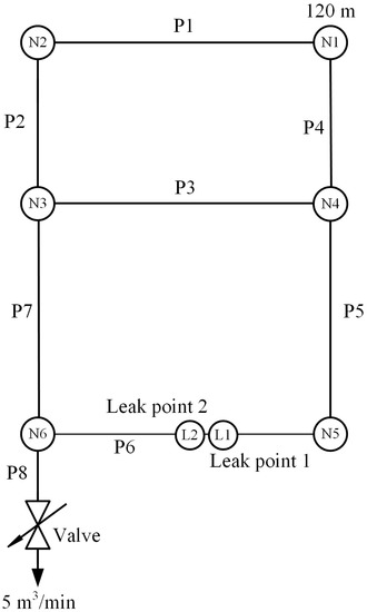 The first scenario (S1) is the one presented in [25], with a layout referred to as pipe network A, as shown in Figure 5. The configuration of this network consists of eight pipes, six nodes, two potential leaks, and one downstream valve, and the characters “N”, “P”, and “L” represent the node, pipe, and leak, respectively. The pipe diameter varies from 250 to 500 mm, while the pipe length varies from 1000 to 1250 m. Nodal consumptions are considered as 0 for all nodes. N1 is considered as a reservoir with 120 m constant-head, and downstream of P8 is a valve with a discharge flow rate of 5 cubic m per min (m3/min). Two potential leaks, denoted as L1 and L2, are both in P6 and are at 300 and 310 m from N5, respectively, with the same CdA = 0.00025 m2 and same QL = 0.5 m3/min. The downstream valve is the only outflow of pipe network A. Hence, the optimum operation point is located at the valve. In order to compare the proposed approach with the work of [25], the operation parameters y and z are fixed to 1 s and −5 m3/min, respectively, for the simulation of a sudden closure of the valve. The characteristics of the nodes and pipes of the pipe network A are listed in Table 1.