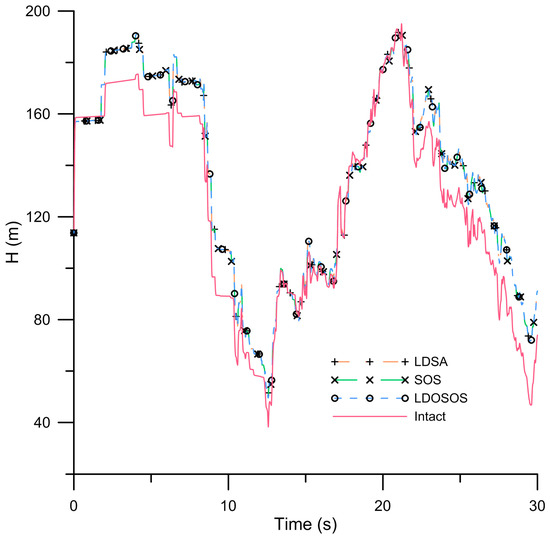 Figure 7 shows the predicted heads versus time at the valve, based on the intact network and the network with two leaks. The predicted head distributions by LDSA, LDSOS, and LDOSOS display very similar transient patterns; however, their efficiencies are quite different in obtaining optimal results. Table 3 gives the results of leak detection for S1 from LDSA, LDSOS, and LDOSOS. The results show that LDOSOS is capable to detect leaks that are close to each other. The LSDA takes 372 min and 9815 iterations, while LDSOS required 120 min and 3481 iterations to obtain the results. The efficiency of LDSOS is better than LDSA. Moreover, LDOSOS takes 50 min and 1469 iterations to complete the detection process and to obtain the optimal locations and CdAs. The convergence and efficiency of LDOSOS is greatly enhanced as a result of the sifting procedure OOA. The computing efficiency of LDOSOS is approximate 86 and 58% better than that of LDSA and LDSOS. The LDOSOS obtained the optimum solution after about 1500 iterations which is significantly less than the other two approaches. Obviously, the performance of LDOSOS is much more efficient than the other two algorithms.
