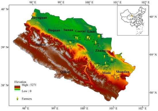 The analysis was based on the dataset collected by the author and collaborators in August 2015, in Zhangye City in the middle reaches of Heihe River Basin in northwestern China. The field area was a typically arid and semi-arid agriculture zone with an average annual precipitation less than 200 mm. Zhangye City is an important agricultural production base that occupies 95% of cultivated land (2668 km2), includes 91% of the population, and generates more than 80% of GDP of the Heihe River Basin. It is also one of the 12 key national commercial grain bases due to its abundant supply of wheat, corn, rice, oilseed rape, flax and other crops. Wheat and maize production accounts for almost 90% of households’ land use. In our study area, agriculture water demands are mainly met from irrigation since the annual precipitation is less than 200 mm. Irrigation agriculture is the largest user of water, accounting for nearly 90% of the total water use.