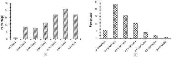 The frequency distribution of TE and IWUE estimates obtained by the SFA methods are shown in Figure 2. The average overall TE for the households is 0.74, indicating that substantial inefficiencies occurred in farming operations of the sample farm households. The value of IWUEs demonstrated even larger inefficiencies. From the frequency distribution of IWUEs, we can find that the average IWUE for the whole sample is 0.24. It is far lower than that of a farmer’s agricultural production TE. When looking specifically at IWUEs, the results indicate that farmers fail to reach their overall technical efficiency levels. It implicated that there appears to be a considerable scope for the water use to be reduced, even with the technology currently available. It also means that if efficiency improves, it should be possible to reallocate a fraction of water to other water demands without really endangering agricultural production or the role small-scale irrigation might play for rural development. Some researchers have ascribed the substantial inefficiencies of irrigation to the poor performance of irrigation schemes and the absence of pricing mechanisms for water [42,43]. They suggested that the introduction of water charges will gradually trigger farmers’ financial incentive to limit their water use or to invest in water-saving technologies.