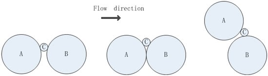 According to the previous studies, the hydraulic criteria are influenced by many soil properties. The soil unit weight [8,10], the friction angle [10], the soil particle size [10,23], the soil grain size distribution [7,21], the coefficient of uniformity [10,24], the stress state [25], and the void ratio [21,22,26] were all shown to influence the critical hydraulic conditions. Despite the wealth of research done so far, few studies have thoroughly examined the influence of the relative position of the soil particles and of the seepage direction on the seepage erosion. The locations of soil particles are completely random, which results in different initiation conditions for different particles. As shown in Figure 1, particle C on the far right of the figure is the particle that will be taken away by the flow most easily. On the other hand, the 2-D seepage flow is inhomogeneous in a seepage field with different flow directions. The seepage forces acting on movable particles are different, causing differences in the initiation of soil particles in a 2-D seepage field. Therefore, a deeper understanding of these two aspects of particle movement is absolutely essential.