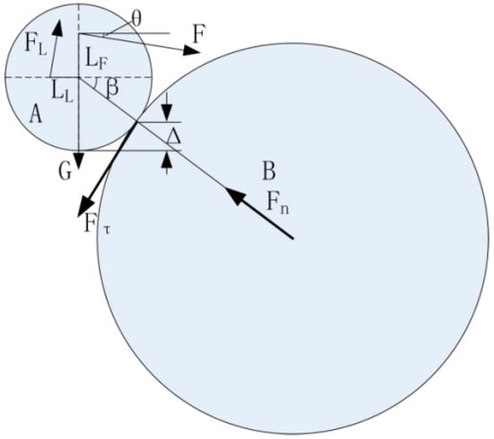 The critical rolling condition of particle A is a moment equilibrium state. The forces on the movable particles are shown in Figure 2 and represented by Equation (5), in which the moments of Fn and Fτ are equal to zero.