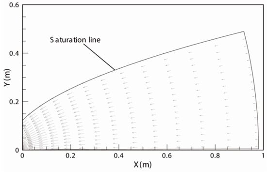 The seepage inside a slope is not uniform. Generally, the seepage velocity of the slope toe is larger and more prone to seepage erosion. To better characterize it, the critical gradient of the seepage in a slope was analyzed. The distribution of critical hydraulic gradients was calculated through Equation (8). The soil E2 [22] was taken as an example. The specimen in exam can be defined as grit sand, and the hydraulic conductivity can be calculated according to Alyamani and Zekâi [32] as 1.0 × 10−4 m/s, which is consistent with the empirical value in Table 1. The seepage field of a vertical slope model (1 m × 0.5 m), with water levels of 0.5 m upstream and 0 m downstream, respectively, is shown in Figure 3. The seepage direction θ can be obtained from the seepage field.
