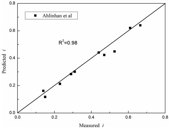 The experimental data were obtained from Ahlinhan et al. [22]. In the examined experiment, five different non-cohesive soils were tested in specially developed test devices, under horizontal seepage flow. The void ratio of the soils varied in the tests. The predicted and experimentally measured data, depicted in Figure 5, matched very well (R2 = 0.98).