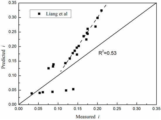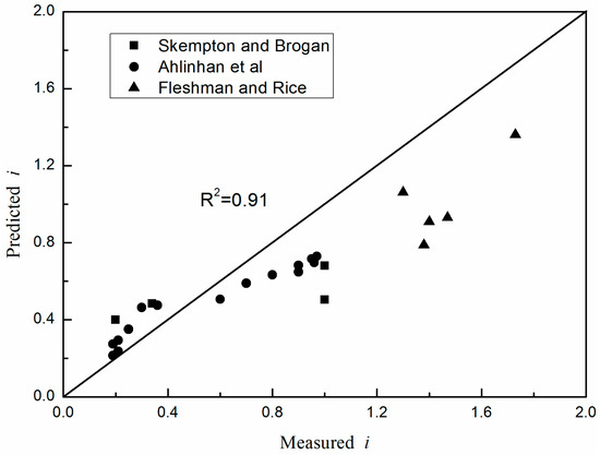 As can be seen from Figure 6, the predicted values did not match with the measured values (R2 = 0.53). The data-points above the solid line indicate that the predicted values were greater than the measured values. This is because the gradients of the soil specimens gradually increased during the test. In smaller gradients, fine particles were removed by the flow, which made the soil much looser. In a looser soil, the measured gradients are smaller than the real gradients. The points below the line indicate that the predicted i were underestimated. This may result from the obstruction caused by the finer particles, which affects the other particles of the group when the hydraulic gradient is small.