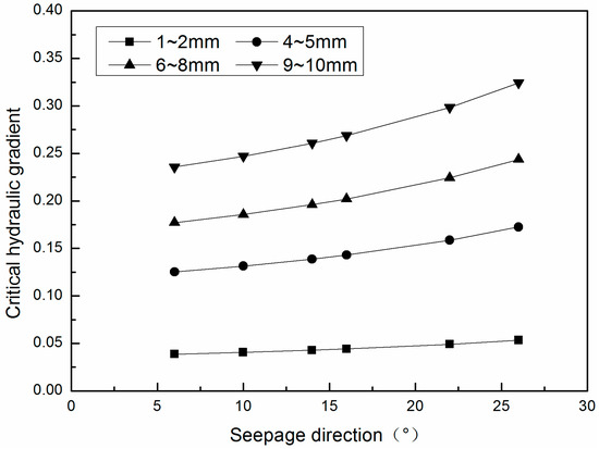 It can be seen that at the same seepage direction angle, the hydraulic gradient at the initiation of the particle increased as the particle size increased. For particles in the same size range, the critical hydraulic gradient was positively correlated with the seepage direction angle, as observed for the experimental results reported in the test. Thus, the critical gradient of the vertical seepage is greater than that of the horizontal flow, as observed by Ahlinhan [22]. The vertical and the horizontal seepages were also studied by Skempton and Adel [9,19], respectively, and similar results were reported. The force analysis of soil particles described above can explain this phenomenon. In the vertical seepage flow, the particles’ movements need to overcome the gravity, while, in the horizontal flow, the particles can roll around large particles, moving downstream. In this situation the seepage force does not need to be greater than the gravity, but it has to overcome the gravity’s moment. In the case of a small seepage force, the seepage force’s moment may be greater than the gravity’s moment, as shown by the analysis of the particles’ exposure degree. Therefore, soil particles are very easily taken away by the horizontal seepage flow.