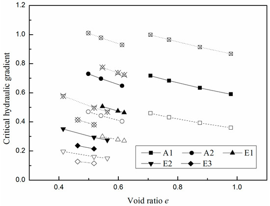 The soil parameters are also important for the critical gradients [7,21,22]. The effects of the void ratio e and the mean grain diameter dθk on the critical gradients are shown in Figure 9. In this figure, the experimental data were obtained from Ahlinhan’s vertical seepage test [22].