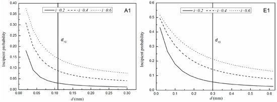 where f (Δ′) is the probability density function of Δ′. In Ahlinhan’s test [22], for hydraulic gradients of 0.2, 0.4 and 0.6 in a horizontal seepage, the initiation probabilities of soil samples A1 and E1 are shown in Figure 10, assuming that Δ′ is uniformly distributed between 0 and 1.