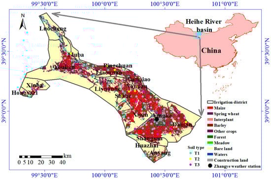 The study area is the middle reaches of Heihe River Basin, which is located in the arid region of northwest China and covers 17 irrigation districts. Figure 1 shows the distribution of landscape units in this area, including the main crops, forest, grassland, bare soil and surface water, which were obtained from land use map and cropping patterns based on remote sensing data from the Western Database (http://www.heihedata.org/). The study area is 6736 km2 consisting of 38% farmland, 14% forest/grass land, 4% river and flood plain, and 41% bare soil. Most of the cultivated lands were planted with maize and spring wheat, which accounted for over 50% of the farmland. The other crops include barley, interplant of spring wheat and maize (relay strip interplant in this region for the purpose of improving crop economic production in this region), and others (mainly various kinds of vegetables). The intensive planting area is distributed in the southern and middle irrigation districts. Table 1 shows the classification of soil texture based on our survey in 2014, which demonstrated that in most areas it is loam at 0–100 cm soil layer, and loam, sand or cobble stone in deep layers. Therefore, the soil types are grouped into three types (T1, T2 and T3) and locations are shown in Figure 1.