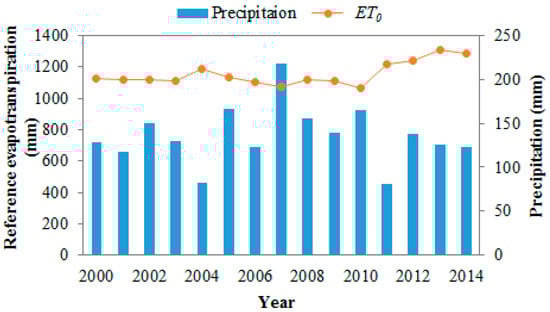 Annual reference evapotranspiration and precipitation in the study area during the year 2000 to 2014.
