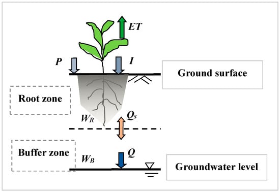 The buffer zone or the area between root zone and groundwater, we assume that it had water connection with root zone through Qs and the surplus water in this zone would recharge to groundwater. Groundwater table depth in most area of the study region is over 3 m. Hence, the phreatic evaporation, i.e., the upward flux from groundwater to root zone, is negligible [61,62]. The water balance and related terms can be calculated from.