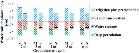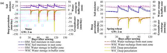 Soil water storage would decrease (negative values) when groundwater was deep with deficit irrigation (Figure 8c,d). In general, soil water storage tended to increase during the growing season when irrigation amounts were high and groundwater was deep with thick buffer zone.