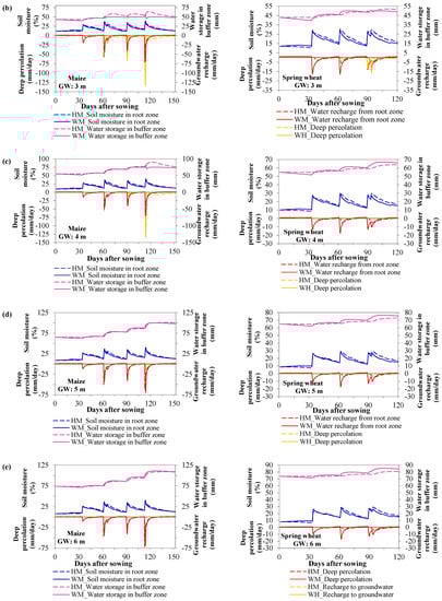 Simulation results of soil moisture, water storage in buffer zone, deep percolation and groundwater recharge for summer maize and spring wheat under the conditions of groundwater depths at 2 m (a), 3 m (b), 4 m (c), 5 m (d) and 6 m (e) (For deep percolation and groundwater recharge, negative values mean downward. HM means the results simulated by HYDRUS-1D, WM means the results calculated by water balance model, and GW means groundwater depth).
