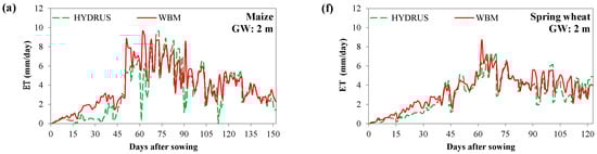 Figure 5 shows the results of evapotranspiration (ET) calculated by these two models under different groundwater depths. ET calculated by these two models had the same trends, which presented as pulsed fluctuations with irregular peak values. The fluctuation of ET was related to the climate and irrigation [75]. ET of both maize and spring wheat decreased with increasing groundwater depth under the same climate and irrigation. The total ET for maize was in the range of 569 mm to 591 mm calculated by water balance model and 570 mm to 578 mm by HYDRUS-1D (Table 5). As to spring wheat, the total ET was in the range of 401 mm to 422 mm calculated by water balance model and 431 mm to 438 mm by HYDRUS-1D. The results are consistent with results simulated by the other study in the same region. For example, Zhu [76] obtained that ET for maize was in the range of 496 mm to 580 mm, whereas for spring wheat it was from 484 mm to 524 mm in the Yingke irrigation district. It indicated that water balance models were able to simulate ET for the main crops in the study area.
