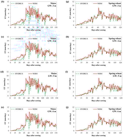 Results of evapotranspiration (ET) for summer maize under the conditions of groundwater depths at 2 m (a), 3 m (b), 4 m (c), 5 m (d) and 6 m (e), and for spring wheat under the conditions of groundwater depths at 2 m (f), 3 m (g), 4 m (h), 5 m (i) and 6 m (j) (GW means groundwater depth and WBM means water balance model).