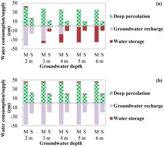Soil water consumption and supply in buffer zone with the initial condition of (a) hydrostatic condition and (b) harvest condition (positive means supply, negative means consumption, M means maize and S means spring wheat).