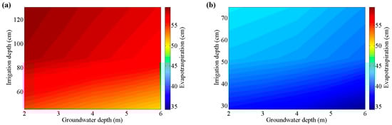 Evapotranspiration of maize was larger than that of spring wheat, and evapotranspiration increased with the increase of irrigation amount for the same groundwater depth (Figure 8a,b). Evapotranspiration had a greater dependence on the amount of water applied when groundwater was near 6 m depth than when groundwater was shallow. For example, reducing the irrigation depth by 60%, evapotranspiration for maize decreased by 8% when groundwater depth was 2–3 m, 9% at 4 m groundwater depth and 10% at 5–6 m. When irrigation application was reduced to 80% in the maize field, evapotranspiration would decrease by 2% under all the groundwater depths. When irrigation increased by 20% or 40%, evapotranspiration of maize would increase by 0.5% to 0.6% for groundwater depths of 2 m and 0.7% to 0.9% for a groundwater table between 5 and 6 m. For spring wheat, evapotranspiration would decrease by 4% to 6% when irrigation water application was decreased by 20% to 40% and it would increase by 1% to 2% when irrigation water application was increased to 120% to 140%.