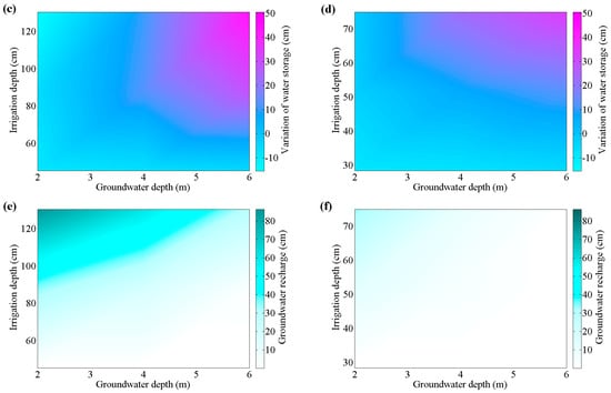 Groundwater recharge would increase with the decrease of groundwater depth and the increase of the irrigation water applications (Figure 8e,f). Under the same groundwater depths, groundwater recharge of maize was larger than that of spring wheat.