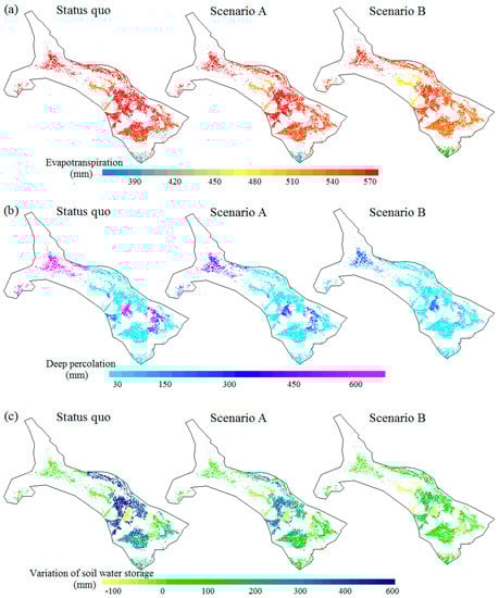 Figure 9 shows that evapotranspiration in the north (e.g., Anyang Irrigation District and Huazhai Irrigation District) was less than that in other irrigation districts under the same scenario. With the implementation of water-saving irrigation practices, evapotranspiration decreased with the reduction of irrigation water application, especially in the middle of the study area, such as in the Liyuanhe Irrigation District. Under the status quo, the total evapotranspiration of farmland cultivated with maize and spring wheat in the study area was 7.06 × 108 m3; it would slightly decrease by 2% and 5% when the irrigation quota cut down to 80% and 60%, respectively. Groundwater recharge in most cropped fields was less than 30 mm. Under the status quo, the recharge in some places in the north and middle of the study area (e.g., the Shahe Irrigation district and the Liyuanhe Irrigation District) was greater than 450 mm. The total amount of groundwater recharge of the main crops reduced with the decrease of irrigation quotas. It would decrease from 1.68 × 108 m3 in status quo, to 1.03 × 108 m3 and 4.75 × 108 m3 under Scenario A and Scenario B. Under the status quo, excessive irrigation would lead to the increase of soil water storage in the vadose zone (2.89 × 108 m3), when irrigation amount reduced to 80% or 60%, the volumes would be decreased by 43% and 86%, respectively.
