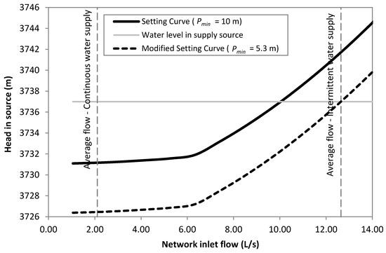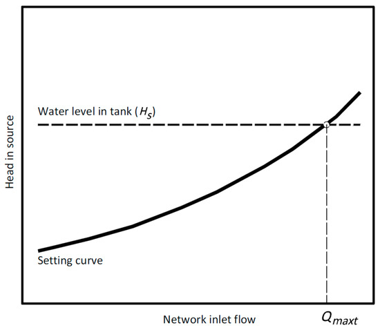 For this purpose, a setting curve—a network-H-Q curve that guarantees the minimum pressure at the lowest pressure node—is used. In a tank supplied network, for example, (see Figure 1), the intersection between the setting curve and the source water level determines the theoretical maximum flow. If due to minimum pressure reduction, the setting curve runs lower, then network capacity is increased.