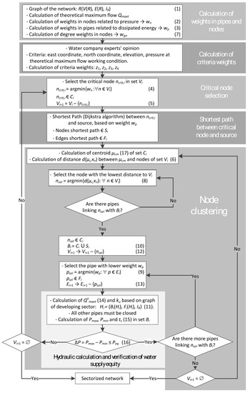 In this paper, an approach based on the theoretical maximum flow concept, which uses soft computing tools from graph theory and cluster analysis [34,35], is developed to define sectors to produce equitable water supply. For node clustering, this process also includes water company expert opinions, from the individuals who best know network details.