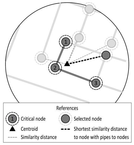 To select the next node to belong to the cluster, we consider the graph used in the hydraulic calculation. The selected node, nsel, is the graph node minimizing (6), that is to say, the graph node with the smallest similarity distance: