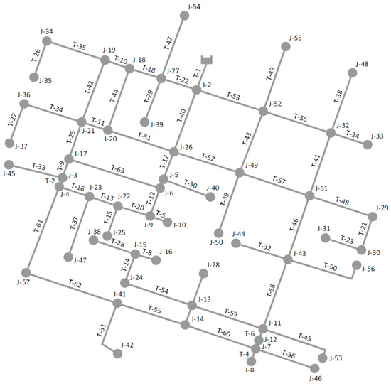 The case-study network, shown in Figure 5 and summarized in Table 2, corresponds to a subsystem of the water supply network of Oruro (Bolivia). This network is supplied for 4 h a day, its demand flow during this period is 12.64 L/s, and its minimum pressure is 5.30 m. The minimum water level at its source is 3737 masl (meters above sea level), and the network average elevation is 3718 masl.