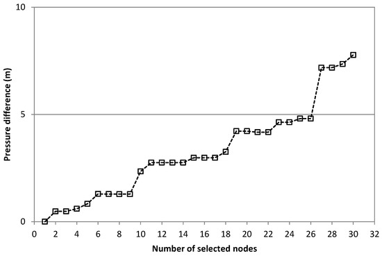 The clustering process produces evident jumps in pressure differences (Figure 7), due to selection of nodes that enable either raising the pressure, or reducing the minimum pressure. After surpassing the pressure difference of 5 m, DMA implementation stops, and according to this condition, the first 26 nodes selected make up the first sector, without considering the first nodes of the identified shortest path (see Figure 11).