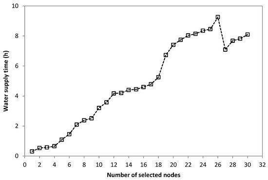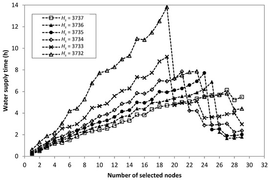 Variation of the water supply time as a function of the selected nodes and the head in the water supply source.