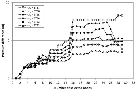 Variation of the pressure difference as a function of the selected nodes and the head in the water supply source.