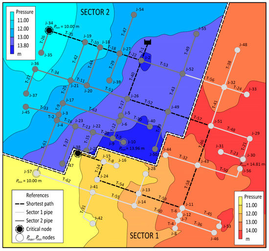 To start building the first sector, we identify node J-38 as the most critical node in the network. Starting from this node, we determine the shortest path to its supply source (see Figure 11, which compiles the final results), and thus we set the first sector. Later, we group nodes according to their similarity distance. Every step is evaluated until each node has a pressure difference that assures the desired equity (Figure 7).