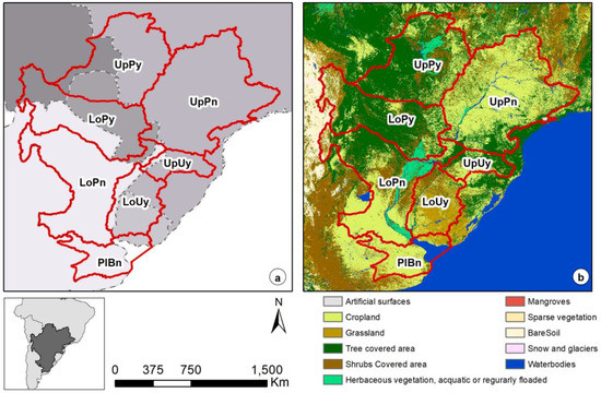 (a) Sub-basins that comprise the La Plata Basin. The continuous red line represents the sub-basin borders; and the discontinuous line and coloured background represent the countries and international administrative borders. (b) Land cover types within the La Plata Basin, based on the GLC-SHARE land cover database [84]. UpPy: Upper Paraguay; UpPn: Upper Paraná; LoPy: Lower Paraguay; LoPn: Lower Paraná; UpUy: Upper Uruguay; LoUy: Lower Uruguay; PlBn: Río de la Plata.