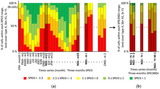 Procedure to calculate the probability of occurrence (expressed as percentage) that a land cover type (A) within a sub-basin (Sbn X1) belongs to each category according to the magnitude of the dry/wet period (from severe droughts (red) to severe wet periods (dark green); see legend) during a specific climate scenario period (ScY1) and for the SPEI3NDJ. (a) Determination of the number of cells belonging to each category for each month (SPEI3). (b) Selection of the SPEI3NDJ values and calculation of the percentage of each category (each different coloured total area divided by the total area by 100).