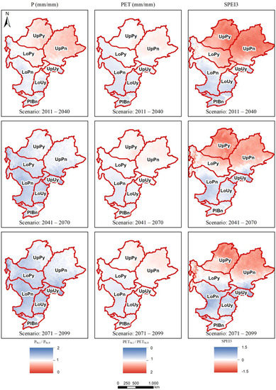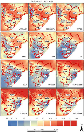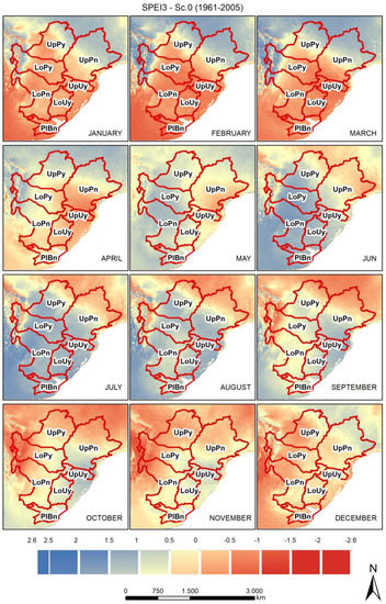 Figure 3 and Figure 6, Figure 7, Figure 8 show SPEI3 variations in future scenarios compared to the current period (Figure 5) following a marked north–south spatial pattern. Climate conditions in all future scenarios were drier (conditioned by PET) in UpPy, UpPn, and LoPy, and wetter (conditioned by P) in the remaining sub-basins. SPEI3 showed an important spatial and temporal variability within each sub-basin throughout the year in all analysed climate scenarios (Figure 5, Figure 6, Figure 7 and Figure 8).