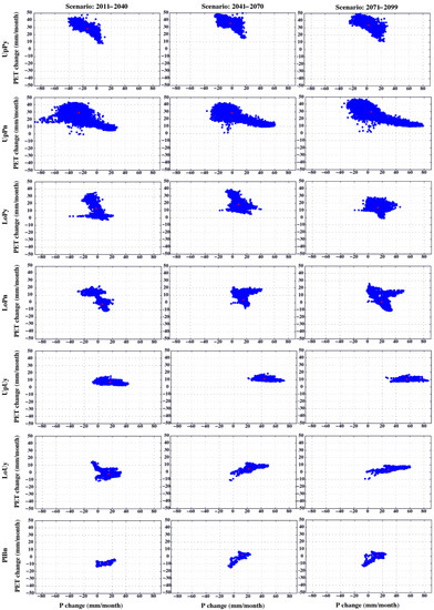 - The changes of P and PET (compared to the current period 1961–2005) for the nearest future scenario 2011–2040 showed a marked north–south spatial pattern within the basin. Our results envisage a decrease of rainfall in the north (negative changes of P) but an increase in the south (positive changes of P), and the opposite for PET. An increase of both P and PET (positive changes) are projected for the periods 2041–2070 and 2070–2099 across the whole basin.