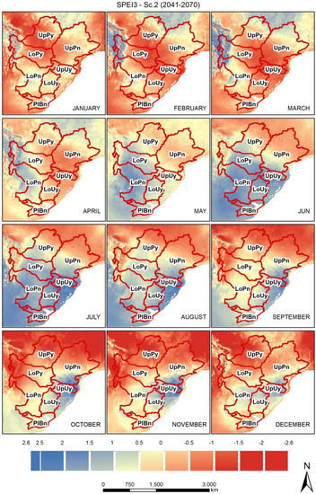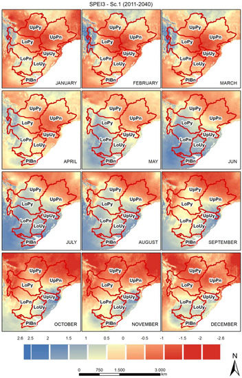 Analyses were developed on a monthly time scale and using the 10 × 10 km cells as calculation units for the seven sub-basins comprising the La Plata Basin. As a first approximation to the identification of spatial patterns on P and PET, we analysed the variation with respect to the current period of both variables for the different future time horizons. To this aim, we averaged the monthly values of P and PET in each cell for the entire period comprising each scenario. Afterwards, the variation of each scenario’s PET and P, relative to Sc0, was calculated per cell. We identified the dry and wet periods for the present climate and future scenarios in each cell by using the three-month SPEI (SPEI3). For each climate scenario and each cell, we temporally averaged on the one hand, the 12 SPIE3 values together (corresponding to a cycle of one year) and, on the other hand, the SPEI3 values corresponding to each three-month period separately; that is January, February, and March (SPEI3JFM), February, March, and April (SPEI3FMA), and so on, until the SPIE3 corresponding to December, January, and February (SPEI3DJF).
