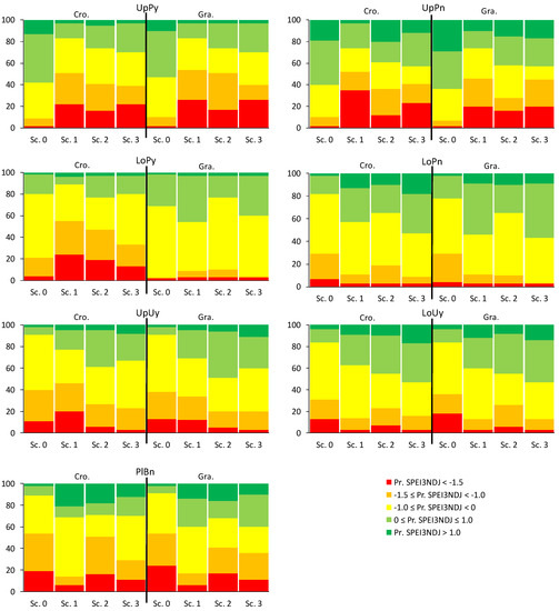 Figure 9 shows the percentages of time (from the total length of each scenario) that the area of each land cover type falls into in each SPEI3NDJ category of dry/wet conditions. In UpPy and UpPn, the percentage of the time of occurrence of both moderate and severe droughts over cropland and grassland areas varied among the sub-basins and scenarios, but it was similar between both land cover types. In UpPy, the likelihood of moderate and severe droughts increased from 9–10% in Sc0 to 52–54% in Sc1, to 41–51% in Sc2, and to 39–40% in Sc3, for cropland and grassland, respectively. In UpPn, moderate and severe droughts increased from 10–7% in Sc0 to 51–47% in Sc1, to 26–28% in Sc2, and 41–45% in Sc3 for cropland and grassland, respectively. In LoPy, relevant differences in relation to the land cover type were found. Meanwhile the likelihood of suffering moderate to severe droughts for the cropland areas increased significantly in the future scenarios (from 21% in Sc0 to 54% in Sc1, to 47% in Sc2, and to 33% in Sc3), and increased slightly (from 2% in Sc0 to 8% in Sc1 and Sc2, and to 3% in Sc3) for grassland areas. In LoPn, moderate and severe droughts occurred in a similar way for both land cover types. Droughts decreased from 29 to 30% in Sc0 to 12–11% for Sc1, from 19 to 11% in Sc2, and from 9 to 3% in Sc3 for cropland and grassland, respectively. In UpUy, moderate and severe droughts slightly increased in Sc1 compared to Sc0 for cropland (40% in Sc0 to 45% in Sc1), and slightly decreased for grassland (38% in Sc0 to 34% in Sc1). Droughts decreased significantly for Sc2, to 27% for cropland and 20% for grassland, and remained the same for Sc3 (23–20%). In LoUy, droughts strongly decreased in Sc1 for cropland and grassland (from 31% in Sc0 to 13% in Sc1, and from 36 to 14%, respectively). In Sc2, the probability of occurrence of moderate and severe droughts was 23% for cropland and 26% for grassland, and in Sc3, 16% for cropland and 13% for grassland. For PlBn, it was 54–55% in Sc0, 14% and 16% in Sc1, 51% and 41% in Sc2, and 29% and 36% for Sc3, for cropland and grassland, respectively (Figure 9).