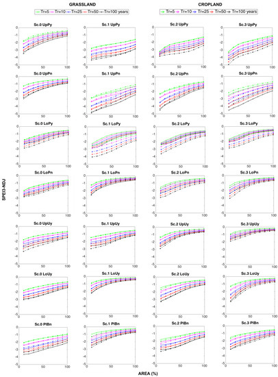 Figure 10 shows the drought SAF curves for each climate scenario, sub-basin and land use. The future climate scenarios were calculated based on SPEI3NDJ values compared to the series from the current period. In UpPy and UpPn, the drought severity increased for the future scenarios and the areas covered by crops and grasses. Projections show severe droughts for the UpPy and UpPn areas covered by crops and grasses for a return period (Tr) equal or higher than 10 years. In LoPy the behaviour of the drought over cropland and grassland areas differs. While the entire cropland area presents severe droughts for Tr equal to five years, the entire grassland areas present moderate droughts for the entire Tr range analysed (five to 100 years). In LoPn, the areas covered by the analysed land uses are projected to suffer less droughts than in the current period. Nevertheless, more than 20% of the analysed areas are projected to suffer moderate droughts in Sc1 and Sc3 for Tr equal to five years. In Sc2 and Tr equal to five years, more than 30% of the analysed areas with moderate and severe droughts are expected. In UpUy, similar behaviour for Sc0 and Sc1 is expected, that is, more than the 50% of the analysed areas are expected to suffer moderate droughts for Tr equal to five years and severe droughts for Tr equal to 25 years. For Sc2, only 10% and for Sc3 5% of the areas indicate moderate droughts with Tr equal to five years and 50% of the areas with Tr equal to 25 years. In LoUy, the situation improves for the Sc1. In Sc0 more than 60% of the analysed areas are under moderate drought conditions for Tr equal to five years and 50% under severe drought conditions for Tr equal to 10 years. However, for Sc1 drought is not expected for Tr equal to five years and 50% of the cropland and grassland areas showed moderate drought conditions for Tr equal to 50 years. For Sc2 and Tr equal or higher than 25 years, the behaviour is similar to Sc0, however, for Sc2 and lower Tr values, the areas under drought were reduced compared with Sc0. For Sc3, there is an important drought severity variability depending on the considered area. While 30% of the area covered by crops and grasses presents moderate conditions for Tr equal to 10 years, no drought conditions are shown in the whole analysed areas and for Tr equal to 100 years. In PlBn, Sc1 presents better drought conditions compared to Sc0. While for Sc0 the whole area presents moderate droughts for Tr equal to five years, for Sc1 no drought conditions are detected for Tr equal to five years. For Sc2 and Sc3 the behaviour of the drought severity is similar to Sc0.