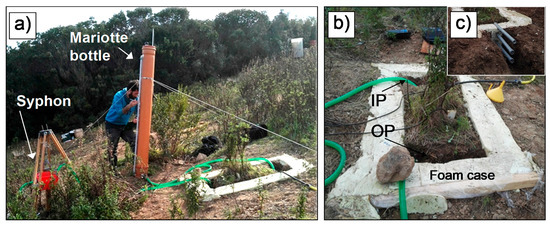 A custom-built Mariotte bottle supplied water and regulated the water level in the IP during the experiments (Figure 1a and Figure 2). It was a 2 m-high PVC pipe with the capacity of about 0.06 m3. The water level in the IP was set by adjusting in height the air-entry tube inlet of the bottle. The bottle discharged into the IP within a fissured PVC pipe wrapped with geotextile to minimize flow turbulence when the bottle outlet-tap was turned on. The discharged volume was computed from the lowering water level measured in the transparent level gauge of the bottle, which had a resolution of 1 mm (28.6 mL·mm−1). Accuracy of the Mariotte device was tested for several discharge rates (from 0.6–4.1 L·min−1, the maximum discharge allowed by the bottle) by measuring the water volumes flowing from the bottle outlet. The mean relative error among the collected volumes and the estimated ones with the readings taken at the bottle was 0.6%, which was considered acceptable for the purposes of this study.