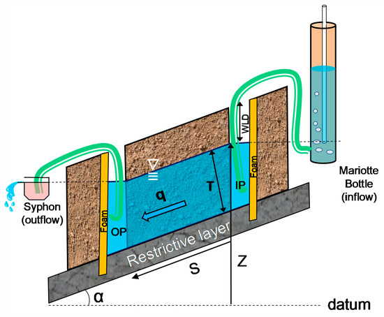 A useful approach for determining representative Ks,l values of macroporous soil is to perform drainage experiments in large-volume soil blocks, or monoliths, encased in situ with impermeable material. These experiments constrain the water flow along a prescribed direction through the soil, in order to define unambiguously the terms of Darcy’s law [22,23]. Field procedures for evaluating the Ks,l in large soil samples are reported, among others, by Blanco-Canqui et al. [24] and Mendoza and Steenhuis [23]. The latter described a device called a “hillslope infiltrometer” by which the lateral drainage from each horizon of a layered soil was collected. The drainage rates were used to compute specific Ks,l values of the soil horizons.