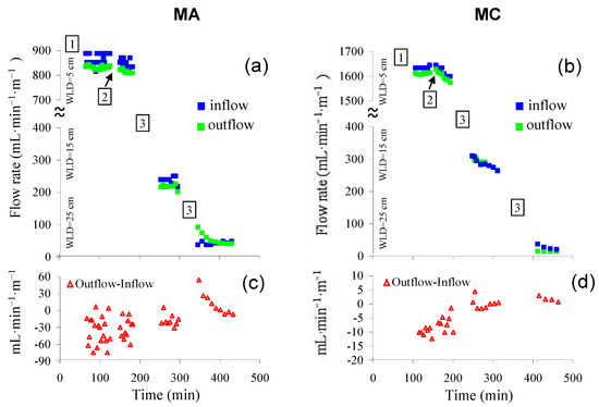 Figure 3a,b show two representative examples of the temporal dynamics of the inflow and outflow rates measured during the drainage experiments. In MA (Figure 3a), the inflows for the water-level depths of 5 cm, 15 cm and 25 cm were almost immediately stable at the beginning of the measurement. The same was true for the outflow rates, except for the imposed WLD of 25 cm. In MC (Figure 3b), for WLD = 5 cm the flows were nearly stable at the start of the measurement, but approximately 140 min after the start of the experiment linearly decreased, and became 3% lower than the initial values after half an hour. A decreasing rate was observed with WLD set to 15 cm as well. Declining flow rates were also observed in MB and MD monoliths when WLD was 5 cm, and in the MD trough at the stage with WLD set to 15 cm. In this last case, a steady-state condition was reached at the end of the stage.
