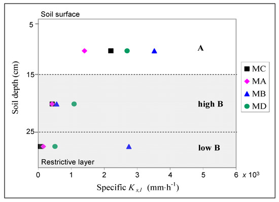 The specific Ks,l values calculated for the A horizon in the soil monoliths, and for the upper and lower layers of the B horizon, are shown in Figure 4. The median value of the specific Ks,l was around 2450 mm·h−1 in the A horizon. This value reduced by 80% in the upper layer of the B horizon. The ratio of the median Ks,l of the lower and upper B layers was 0.67 or 0.31, depending on whether or not the monolith MB was included in the calculation.