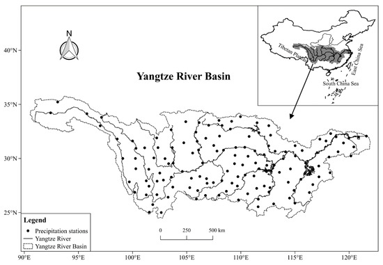 The Yangtze River (also known as Changjiang) is the longest river in China, extending from the Tibetan Plateau to the East China Sea, about 6300 km long (Figure 1). Its drainage area occupied one-fifth of China with one-third of the country’s population. The basin climate is characterized by complex patterns of precipitation and subject to periodic flood and drought events throughout history [1,2]. Precipitation variability both in space and time can impact the uneven distribution of water resources [3], and the induced extreme events have caused severe economic losses and casualties [1,4,5]. For instances, 4,970,000 houses were flattened by the flood in 1998 occurring over the whole basin [6]. In addition, drought-flood abrupt alteration and continuous droughts that cross seasons are increasingly frequent over the Yangtze River Basin. The Chongqing city, which experienced a once-in-a-century drought in 2006, was hit by torrential rain in 2007. Consequently, analyzing the spatiotemporal variability of extreme precipitation events in the Yangtze River Basin is highly important.