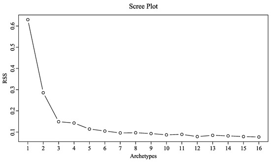 Scree plot of the result from AA. The maximum number of archetypes is initially set as 16 and eight chains were set to run to obtain a global optimum. We used the non-interference-based “elbow criterion” on the RSS curve to select the appropriate number of archetypes.