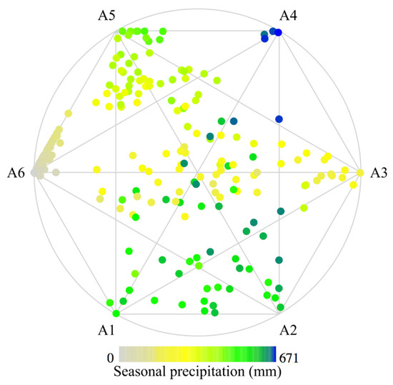 We present a simplex plot [34] (Figure 3) of the total average observed seasonal precipitation over the Yangtze River Basin to identify what precipitation that each archetype can represent. The stochastic nature of mixture coefficient implies that they exist on a standard p − 1 (i.e., 6 for p) simplex with p archetype as the corner, and coefficients as the coordinate with respect to these corners. These data were projected into two dimensions by a skew orthogonal transformation and all the vertices of the simplex plot are shown on a circle connected by edges. Observed precipitation with similar spatial patterns to one archetype will appear closer to the corresponding vertex. This plot provides a visual measure of the frequency of each archetype. The archetypes are notated as Ak for the k-th archetypal pattern.