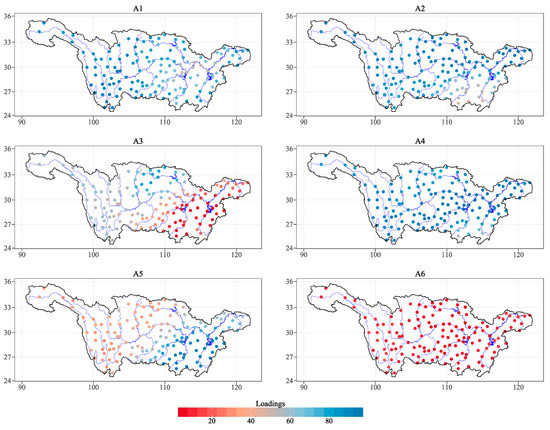 A1 and A2 present the mostly common archetypes over the basin, and they exhibit a similar spatial pattern of extremes with closer values, even though in some parts they both show a small loading value. The central part of the A1 pattern and southeastern part of the A2 pattern show a weaker loading value than the other region. We can also see that the loadings of A4 are high across all stations over the Yangtze River Basin, which indicates that some large-scale extreme climate events have a wide influence on the whole basin (e.g., the continuous precipitation in the wet season over the region in 1998). On the other hand, A6 represents individuals which are small in loadings and associated with little total or no precipitation. This represents the whole basin was experiencing a period of dry conditions, such as a drought in East Asia relating to the La Niña events [2], and little total precipitation in winter [8]. A3 and A5 reflect the difference between the Western and Eastern Yangtze River Basin, but this difference is opposite for the two archetypes. A3 extends from the southeastern part with less precipitation to the northern part with large precipitation, while A5 dominates the southeastern basin with above-average precipitation, and westward with below-average precipitation. It is likely due to the southeastern part being impacted by the atmospheric circulation from the Pacific, while the western basin is subject to the monsoon from the Indian Ocean.