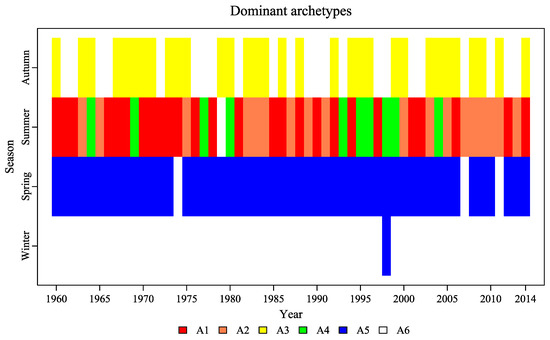 To explore the seasonal variations and inter-annual trend of archetypes, we show the dominant archetypes for each season within one year in Figure 5. The blank area in the figure denotes the null archetype associated with little total or no precipitation for that season. We can see that the winter is the mostly common season with null cases, except in 1998. This is due to the basin being dominated by the East Asia winter monsoon with less water vapor compared to other seasons [35]. During 1997–1998, the El Niño event had a lagged influence on the climate variability over the Yangtze River Basin, resulting in much more precipitation in winter [5,6,36]. The A5 prevails in spring during the whole period of 1960–2014. In the recent decade, because of the frequent occurrence of drought events (e.g., the years of 2007 and 2011 [37]), we can observe a couple of null archetypes. The periodic A6 and A3 dominate the below-average precipitation in autumn. In summary, the winter (A6-dry) and spring (A5-variable) consist almost entirely of a single archetype, and even autumn is made up of the two driest archetypes (A3 and A6), whereas summer precipitation can range from extremely dry (A6) to normal (A1 and A2) to extremely wet (A4). Thus, understanding what makes summer precipitation so variable is important.