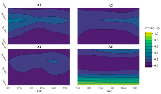The probability of one discrete archetype occurrence in each season within one year is shown in Figure 6. Here, we focused on the frequency of the archetype occurrence in summer. A1 tended to be more frequent in summer before 1990, while A2 started to dominate the summer precipitation after 1990. This may be associated with the shift of the location of the El Niño developing phase from the Eastern Pacific to the Central Pacific since the early 1990s. Yu et al. [38] pointed out that the reason for this shift is possibly from the influence of AMO. A4 represents the events with particularly rare and extremely heavy precipitation in one season, which mainly occurred in the years around 2000 (e.g., the serious storm and flood in 1998 because of the infrequent El Niño occurrence [5,6,36]). The result is also consistent with the result of the dominant archetype analysis. A6 represents the events with below average or no precipitation, which are associated with the East Asia winter monsoon with the Siberian High bringing less moisture [35,39]. The precipitation falling in winter is far less than that in other seasons. Therefore, the probability of A6 occurrence is stable with a high value in winter during the whole period of 1960–2014.