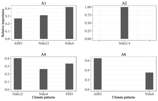 The strongest determinant of the ensuing A1 is Niño4, which is consistent with the strong correlation of Niño4 and A1. Niño12 and AMO rank the second and third place, respectively. For the archetype A2, with which only one climate pattern was identified to be significantly correlated (i.e., Niño3.4), we consider Niño3.4 as the dominant driving factor with a value of 1.0 denoting the relative importance. For the archetype A4, we can see the largest contribution is from Niño12, which occurred in the Eastern Pacific Ocean and is associated with the ENSO events. For the null archetype A6, which represents the events with below-average precipitation, AMO contributes most to the droughts. In general, the ENSO indices including Niño12, Niño3.4, and Niño4 are connected to the archetypes representing the events with above average precipitation (e.g., A1, A2, and A4), while AMO can contribute much to the events with below average precipitation (e.g., A6).